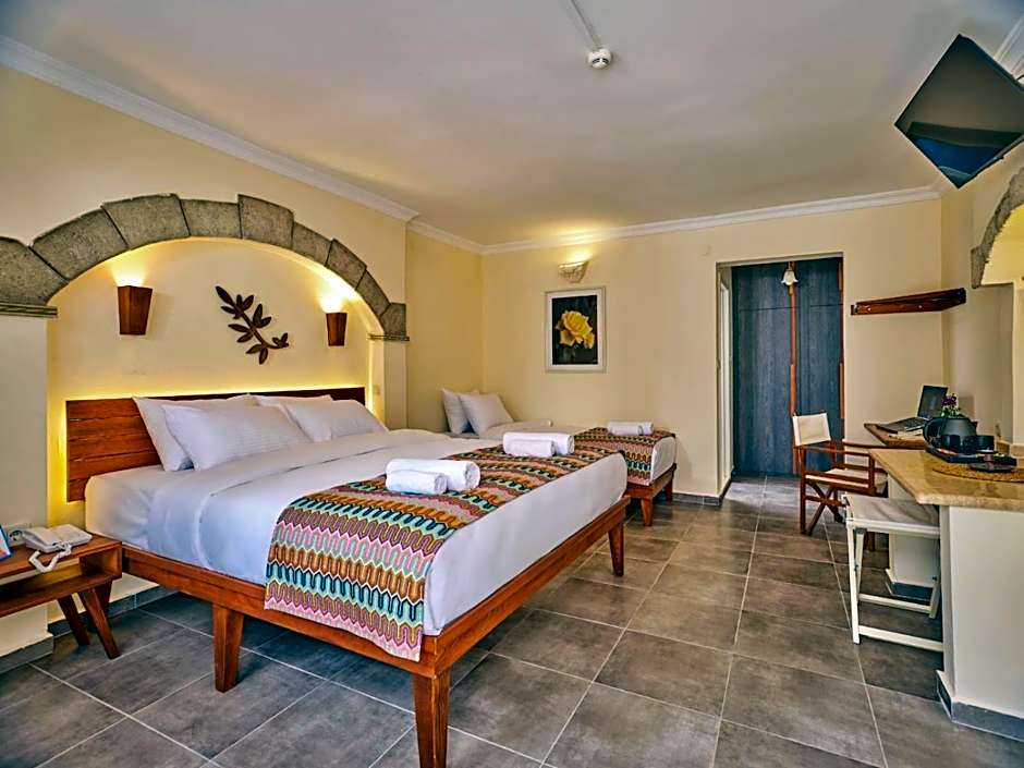This air-conditioned family room is consisted of of a flat-screen TV with satellite channels, a private bathroom as well as a balcony with garden views. The unit has 4 beds.